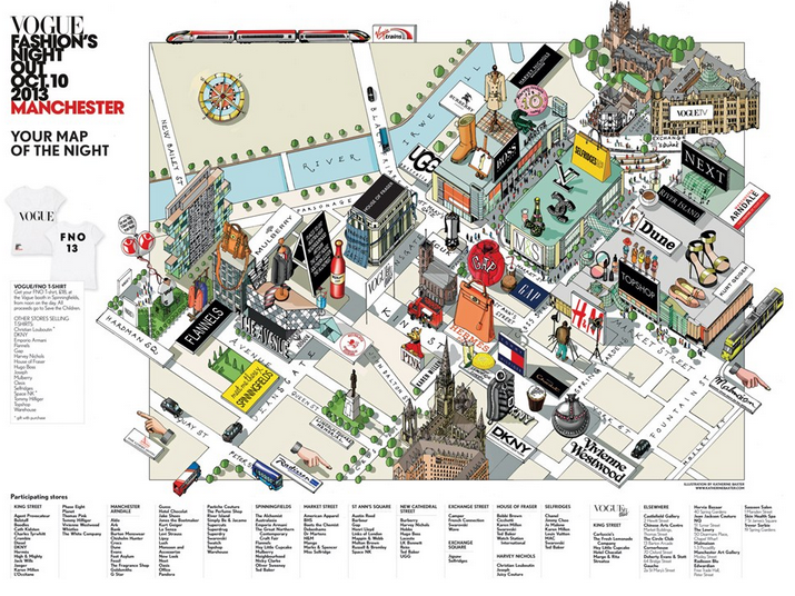 If you aren’t sure where to go tonight, illustrator Katherine Baxter has created an exclusive map of all of tonight’s going on in and around Manchester. You can pick up your official Vogue Fashion Night Out in Manchester 2013 map at the Arndale, Harvey Nichols, House of Fraser or Selfridges (or download it here). Heck, pretty much every store is doing something and you definitely won’t be short of something to do. I’ve put myself a little schedule together but who knows how things will go today? Lets just enjoy it, eh?!