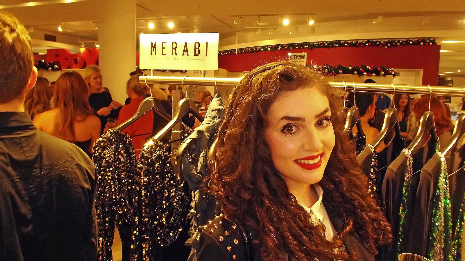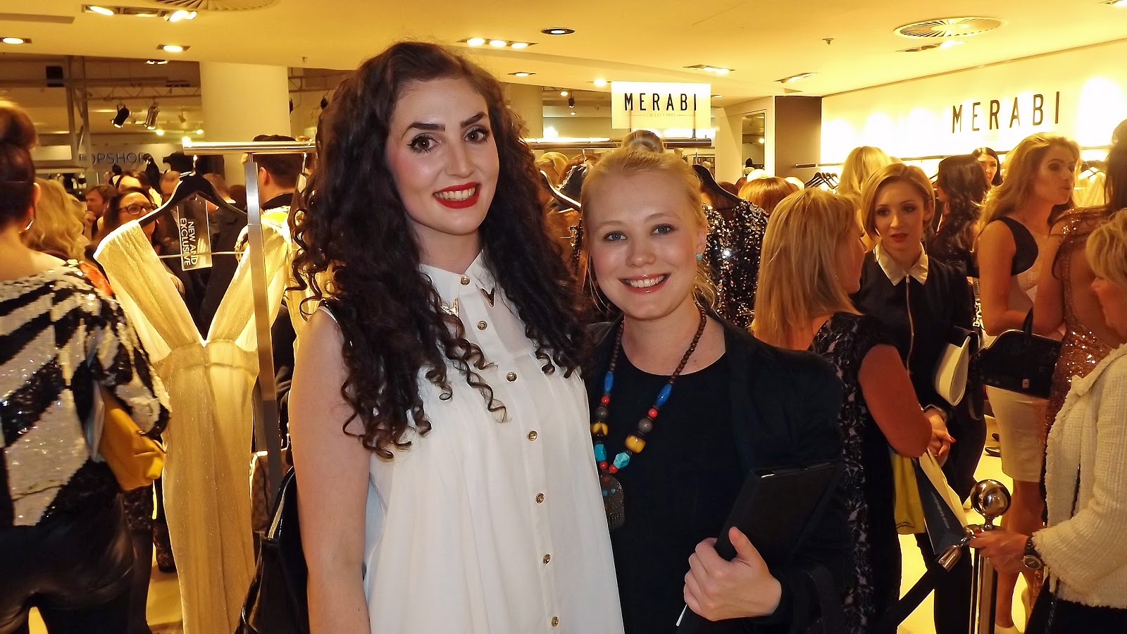 I wasn’t sure what to wear so I went for a smart-casual combination. I wore these faux-leather black leggings and my black faux-seude wedges paired with this beautiful gold detail shirt and studded blazer from MissPap. It turned out to be a good choice as although many of the celebrity clients and Merabi herself were dressed up to the 9s in her wonderful pieces, much of the other press were a lot more casual. Turned out to be the perfect combination!